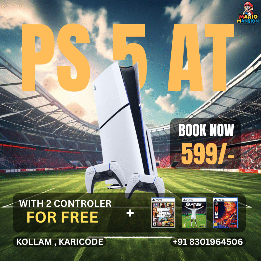 Looking for PS5 rental in Kollam? Get a PS5 with GTA 5, WWE & FIFA free, plus 2 controllers.